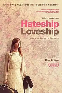 Hateship, Loveship is an American drama film directed by Liza Johnson and written by Mark Poirier, based on the 2001 short story "Hateship, Friendship, Courtship, Loveship, Marriage" by Alice Munro. The film stars Kristen Wiig, Hailee Steinfeld, Guy Pearce, Jennifer Jason Leigh and Nick Nolte. It premiered at the 2013 Toronto International Film Festival on September 6, 2013.[2] On 11 March 2014, the official trailer for the film was released.