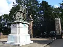 Statue of the 3rd Marquess of Salisbury, before the gates to Hatfield House: the southern wall of the memorial garden is visible to the far left