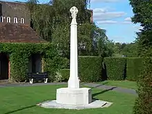 The memorial cross is a typical Baker design, with an octagonal cross section, standing on an octagonal base. Baker had proposed a similar design of memorial cross to the Imperial War Graves Commission (now Commonwealth War Graves Commission), but a different design by Sir Reginald Blomfield was selected instead: the Cross of Sacrifice familiar at many CWGC cemeteries. Baker used versions of his cross in many of the municipal war memorials that he was commissioned to design after the First World War. He was also responsible for the design of 113 cemeteries on the Western Front, including Tyne Cot, Delville Wood South African National Memorial and Neuve-Chapelle Indian Memorial.