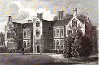Her brother Peter Calmel had died two years previously and named "William Crawford" and "Elizabeth Dorothea Crawford" in his will, leaving them annuities. When he bought Haughley Hall William Crawford was sixty and he came to the house accompanied by his wife and two unmarried daughters Elizabeth (1786-1861) and Harriet (1794-1858). He made some alterations to the building. An engraving of the Hall in 1827 is shown. His eldest son Thomas who was to be his heir died in 1830 so his younger son William Henry who had since become a clergyman inherited the estate in 1835 when he died.