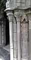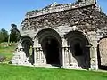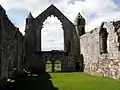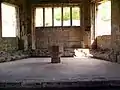 From the western side of the ruins, the abbot's hall window remains the dominant structure, but walls of the kitchen and dining areas and of the main cloister are easily made out beyond it. It is possible to walk through the entrance to the undercroft of the frater or refectory, below the great west refectory window, which would once have been an impressive structure when it was inserted in the 13th century. The refectory and its undercroft separated the little cloister to the south from the larger northern cloister. The undercroft was the main storage area for provisions,[100] which were brought in through its western entrance from the abbey grounds. A sluice supplied by a stream is on the northern side of the undercroft. The undercroft linked via service steps to the frater above, and by a door to the kitchens, which lay along the western side of the little cloister. The large fireplaces in the west wall of the kitchen range are still very prominent. The frater, being on the upper floor, has gone, but the main cloister wall closest its entrance has two large, arched niches that contained the lavers for the canons' ceremonial ablution before meals. It is not clear how water was supplied to the lavers and all trace of the wash basins has disappeared.[101]