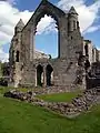 The public entrance to the abbey site is now on the south side, where the extant ruins are at their most impressive. Visitors are confronted by the elaborately decorated, five-sided bay window of the abbot's private quarters. This is of very late date – probably the second half of the 15th century.[4] The accommodation for the abbots became steadily more luxurious and more private throughout the history of the abbey. Beyond the window are remains of the 12th-century abbot's rooms, which were on a far more modest scale. The large and impressive abbot's hall, with its great west window of six lights, was built in the 14th century, partly over some of the 12th-century abbot's buildings. Below the window doorways led to the service buildings: remains and traces of these mainly 12th-century structures are still visible beyond the western end of the hall. This southern end of the site was considerably modified but preserved after the dissolution, when it was used as a family residence.