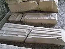 The Haughmond Abbey buildings, like those at Lillsehall, show signs of Cistercian architectural influence.[56] The standing remains are of white sandstone rubble construction with ashlar dressings. At the highest points, floors and lower walls were made by shaping the red sandstone that underlies the site.[97] Most of the buildings were grouped around two cloisters. They include: the foundations and west cloister doorway of the late 12th- and early 14th-century church; the late 12th-century chapter house (which is still roofed); the west wall of the warming house and dorter; the walls of the frater and its undercroft; and the early 13th century infirmary, flanked by the abbot's lodging to the east. Apart from a few walls, little else has survived from the western side of the site and, at the northern edge, the abbey church has completely disappeared – although the cruciform ground plan is still clearly visible.