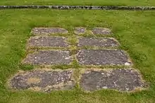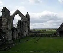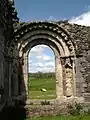 The abbey site would have been enclosed by a perimeter ditch but this is no longer apparent. The precinct is still partly enclosed by a wall of undressed stone, around the south and west sides. The entrance to the abbey was about 130 metres north of the church, where the gatehouse has been traced.[97] There would have been other buildings serving the community and its guests between the gatehouse and the church but these too remain only in bare outline. The remains of the artificial landscape created in the Middle Ages are discernible further to the north. A reservoir and three possible fish ponds can be identified, along with various other medieval features.