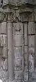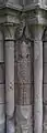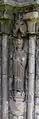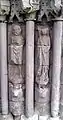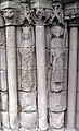 In the absence of much documentary evidence, the abbey's art may shed some light on the values held dear by the community. In the 14th century a number of figures were carved on the previously plain shafts of the arches at the processional entrance to the church and at the entrance to the chapter house. St Peter and St Paul flank the church entrance used by the canons to enter the church for the Canonical Hours. These were the saints most closely associated with the Papacy, from which both the order and the abbey took their authority. For the chapter house,[79] Augustine of Hippo, eponym of the order, and St John the Evangelist, patron saint of the abbey, were obvious choices. The remaining saints were all illustrative of martyrdom, austerity or spiritual struggle. Thomas Becket, murdered on the orders of Henry II, one of Haughmond's major benefactors, was a martyr whose cult at Canterbury was the focus for medieval England's most important pilgrimage. Catherine of Alexandria, seen as a virgin martyr, is portrayed with her wheel of martyrdom, taking revenge on the Emperor Maxentius. John the Baptist, closely associated with asceticism and speaking truth to power, and a Biblical type for Becket, clutches the lamb and flag symbol of the Agnus Dei. He is accompanied by Margaret of Antioch, who is spearing a dragon, a female counterpart to St Michael. St Winifred, a third virgin martyr, whose relics were kept at nearby Shrewsbury Abbey, is shown with her persecutor Caradog sinking into the ground. Facing her, St Michael the Archangel, armed with spear and shield, treads down and impales a dragon, representing Satan.