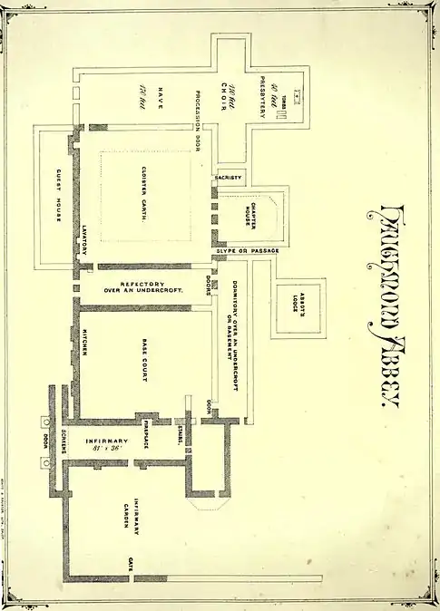 The site was excavated in 1907[95] under the supervision of William Henry St John Hope and Harold Brakspear, who published their findings in The Archaeological Journal. More excavations took place between 1975 and 1979, directed by Jeffrey West for the Department of the Environment, in the north part of the cloister, the south transept and the south part of the choir of the abbey church, with the dual purpose of recovering the plan of the cloister walk and re-examining the early church identified by the 1907 excavation. Further work was undertaken by English Heritage in 2002[96] and is the most comprehensive analysis and survey of the earthworks to be undertaken to date.