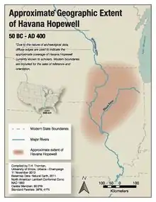 The Havana Hopewell culture were a Hopewellian people who lived in the Illinois River and Mississippi River valleys in Iowa, Illinois, and Missouri from 200 BCE to 400 CE.[1]