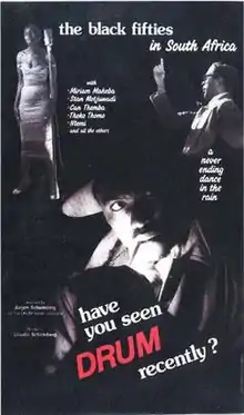 Have You Seen Drum Recently? is a 1989 film which uses photographs from the Drum archives to tell the story of the magazine and documents its contribution to the cultural and political life of South Africa.