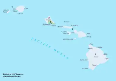 Members of the House of Representatives are elected every two years by popular vote within a congressional district.[12] From in the 86th Congress through the 91st Congress, both of Hawaii's representatives were elected from Hawaii's at-large congressional district, but in 1969, the Hawaii legislature passed a law creating Hawaii's first and second congressional district, which elected representatives to the 92nd Congress.[13] The representatives from the two new districts, Patsy Mink and Spark Matsunaga, were also the last two representatives of the seats in the at-large district. Every ten years, the number of seats in the House apportioned to every state is recalculated based on the state's population as determined by the United States census.[14] Hawaii had one seat until the 1960 United States census allotted Hawaii a second seat, which was first filled by Thomas Gill in the 1962 House elections.[15]