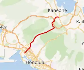 The highway passes through the Wilson Tunnel, and takes commuters from the towns of Kāneʻohe and Kailua on the windward (northeast) side of the island, through Kalihi Valley into Honolulu on the leeward (south) side of the island. The other trans-Koʻolau highways are Pali Highway and Interstate H-3. There is a runaway truck ramp on the highway.[1]