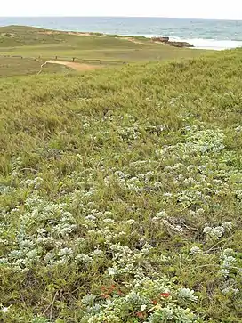 The ecoregion includes both grasslands and mixed shrublands. Kāwelu (Eragrostis variabilis), mauʻu ʻakiʻaki (Fimbristylis cymosa), ʻakiʻaki (Sporobolus virginicus), and Lepturus repens are common grassland plants. Shrublands are dominated by ʻilima (Sida fallax), ʻaʻaliʻi (Dodonaea viscosa), naupaka (Scaevola spp.), hinahina kū kahakai (Heliotropium anomalum var. argenteum), kīpūkai (Heliotropium curassavicum), maʻo (Gossypium tomentosum), ʻakoko (Euphorbia spp.), ʻāheahea (Chenopodium oahuense), naio (Myoporum sandwicense), kolokolo kahakai (Vitex rotundifolia), and pūkiawe (Styphelia tameiameiae).[2] More than 90% of the plant species found in this ecoregion are endemic, including ʻōhai (Sesbania tomentosa),[5] ʻāwiwi (Schenkia sebaeoides), and wahine noho kula (Isodendrion pyrifolium).[6]