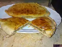 Hawawshi (sometimes spelled hawwaoshi; Egyptian Arabic: حواوشي; IPA: [ħæˈwæwʃi]) is a traditional Egyptian dish. It is a pita stuffed with minced meat and spiced with onions, pepper, parsley, and occasionally chilies. The major variants of hawawshi are "baladi" (standard) and Alexandrian.[1] In most of Egypt, it is baked by filling the flat Egyptian bread with the meat mix and then baking it in the oven. In Alexandria, the ingredients are placed between two circular layers of dough, then baked in an oven.[2] Alexandrian hawawshi also usually have different spices and seasonings.[1] Hawawshi has spread to other countries in the Middle East and North Africa with some variation. In the Levant, it is made using saj bread and includes hot peppers in the filling.[3] In Algeria, it is known as "muhajib" and is eaten with soup or a yoghurt salad.[3]