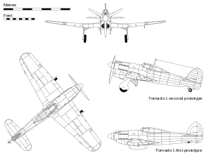 The Vulture was effectively cancelled by Rolls-Royce in July 1941, partly due to the problems experienced in its use on the Avro Manchester, but mostly to free up resources for Merlin development and production. The Rolls-Royce Merlin was also starting to deliver the same power levels. However, the Vulture engine installation in the Tornado was relatively trouble free[2] and the aircraft itself had fewer problems in flight than its Sabre-engined counterpart. The third prototype (HG641), the only other Tornado to fly, was flown on 23 October 1941, powered by a Bristol Centaurus CE.4S sleeve valve radial engine. This Tornado was built from two incomplete production airframes (R7937 and R7938), was a testbed for a number of Centaurus engine/propeller combinations and was the progenitor of the Hawker Tempest II.
