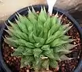 A distinctive feature is the slight bristley "awn" on the margins of the leaves of most varieties. In some, the leaves terminate in a long bristle or thread. Its leaves are not recurved like the "retuse" Haworthias (e.g. Haworthia mirabilis or Haworthia retusa).