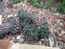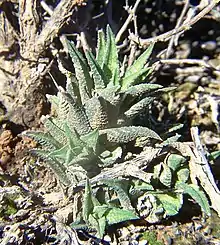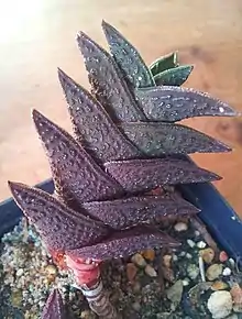 Phylogenetic studies, particularly from 2010 onwards, showed that Haworthia and other genera related to Aloe were not monophyletic.[6][7] Accordingly, in 2013, Rowley separated most of the species formerly placed in Haworthia subg. Hexangulares into a new genus, Haworthiopsis.[8] Haworthiopsis was revised in 2013 by Manning et al. so that the genus more closely correlated with the former subgenus,[2] a revision described as "more coherent" by Gildenhuys and Klopper in 2016.[3]
