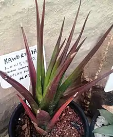 The taxonomic history of the genus is complex. In 1753, Carl Linnaeus followed authors before him in using the genus Aloe for a wide range of plants now placed in the tribe Aloeae by those using the broad circumscription of the family Asphodelaceae (sensu APG III onwards). Linnaeus's Aloe species included two now placed in Haworthiopsis. The genus Haworthia was established by Henri Auguste Duval in 1809 for former Aloe species with smaller whitish two-lipped (bilabiate) flowers. Many additional taxa were later added, at both species and infraspecies ranks. This has been described as "causing a great deal of confusion".[3] In 1971, M.B. Bayer divided Haworthia into three subgenera: H. subg. Haworthia, H. subg. Hexangulares and H. subg. Robustipedunculatae.[5]