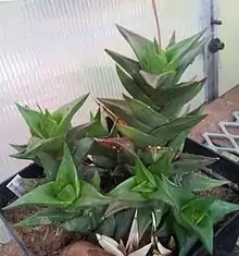 The species was formerly placed in Haworthia subgenus Hexangulares. Phylogenetic studies have demonstrated that subgenus Hexangulares is actually relatively unrelated to other haworthias (being more closely related to Gasteria). The species was therefore moved to Haworthiopsis.[2][3]