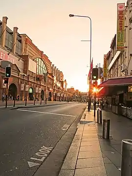 Hay Street's eastern terminus is at the junction of Elizabeth Street, with its western terminus at the junction with Darling Drive. After passing beneath the City Circle railway viaduct, it passes along the northern side of Belmore Park. At the intersection with Pitt Street, the Inner West Light Rail line cuts in having descended from Central station.[1] It then passes to the south of the Capitol Theatre to George Street where the Inner West Light Rail crosses the CBD and South East Light Rail. Passing through Haymarket, to the south of Chinatown and the north of Paddy's Markets, it then continues to Darling Drive.[2]