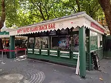 The Hayes forms a rectangular space in the centre of Cardiff, bounded to the east by St David's Hall and to the west by the former David Morgan's department store.[1] At its, triangular, northern end, a pedestrian space forms Hayes Island, the location of the snack bar, and of a statue of John Batchelor, a Victorian Mayor of Cardiff.[lower-alpha 1][3] In the early 20th century, Cardiff Corporation Tramways was established to operate electric trams throughout the city, replacing the previous horse tram system.[4] In addition to passenger services, the Corporation operated an extensive parcel distribution service. The Hayes Island Snack Bar was built in 1911 as a parcels depot.[5] It continued in use until 1942, when the parcel service ceased. In 1949, the structure was redeveloped and reopened as a snack bar. It continues in operation and in 2018 celebrated its 70th anniversary as the oldest operating snack bar in Wales[6] and an “unmistakeable Cardiff landmark.”[7][8]