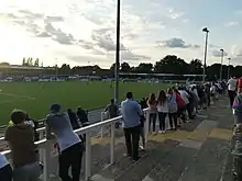 The banking was later replaced by concrete terracing, with both ends of the pitch later covered.[5] The original stand burned down in October 1992,[5] and was replaced by a much smaller 320-seat stand, which was opened the following year.[4] Seats obtained from the London Aquatics Centre were installed behind one goal to meet ground grading regulations after promotion to the National League.[5]