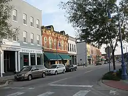 The district developed between 1865 and 1930. The buildings were built in three periods:1865-1880, 1880–1900, and 1900–1930.[2] They are two-story, brick, vernacular commercial structures. The first floors are commercial spaces with cast-iron storefronts, and the buildings are capped with metal cornices. The more elaborate decorative details are found on the buildings that were built in the 1880s and the 1890s. The simplest buildings are the oldest. The buildings north of the Main Street/Pearl Street intersection have primary facades on both streets.