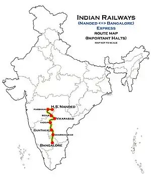 It operates as train number 16593 from Hazur Sahib Nanded to Bangalore City and as train number 16594 in the reverse direction, serving the states of Maharashtra, Andhra Pradesh, Telangana & Karnataka. The train covers the distance of 1,031 km (641 mi) in 24 hours 17 mins approximately at a speed of (42.6 km/h (26.5 mph)).[2][3]