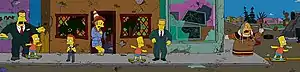This was the first new episode to air following the release of The Simpsons Movie, and the episode's opening sequence is a callback to the film.[6] Bart writes "I will not wait 20 years to make another movie" on the chalkboard and skateboards through Springfield, which is still recovering from the dome incident. Several movie characters reappear, including President Schwarzenegger, the Multi-Eyed Squirrel, Colin, Russ Cargill, and the Medicine Woman.[7] The Simpsons' new house is still under construction, and the silo Homer used to store feces from his pig, Plopper is strapped to his car. Plopper is also featured for the first time in the series, during the couch gag, and Homer refers to him as "my summer love."[8]