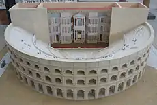 The bust was discovered in 1823 at the same time as a bas-relief representing Apollo and Marsyas in a trench dug in a road near the location of the ancient theatre of Arles.[4] Given the location of its discovery, the statue was taken to be part of the decoration of the postscaenium which decorated the stage building of the ancient theatre, probably located in one of the niches which flanked the royal gate (valva regia), mirroring the Venus of Arles, which was found near this location some two centuries earlier and together framing the monumental statue of Augustus in the guise of Apollo, to whom the theatre was dedicated.[5] Like the Venus of Arles, the Head of Arles has a hole at the front of head which probably allowed the attachment of a metal star or diadem, a fact which suggests that the two statues were originally designed as a pair.[6]