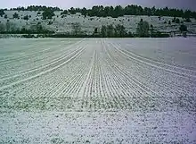 A Headland, in agriculture, is the area at each end of a planted field. [1] In some areas of the United States, this area is known as the Turnrow. It is used for turning around with farm implements during field operations and is the first area to be harvested to minimize crop damage. The rows run perpendicular to the lay of the field and are usually two, three or four times the width of the implement used for planting the field.