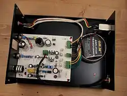 A headphone amplifier is a low-powered audio amplifier designed particularly to drive headphones worn on or in the ears, instead of loudspeakers in speaker enclosures. Most commonly, headphone amplifiers are found embedded in electronic devices that have a headphone jack, such as integrated amplifiers, portable music players (e.g., iPods), and televisions. However, standalone units are used, especially in audiophile markets and in professional audio applications, such as music studios. Headphone amplifiers are available in consumer-grade models used by hi-fi enthusiasts and audiophiles and professional audio models, which are used in recording studios.