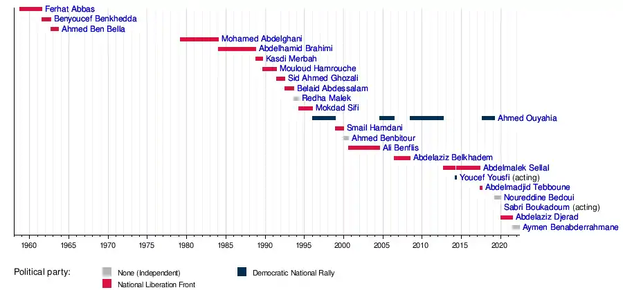 A total of eighteen people have served as Prime Minister of Algeria (not counting two Presidents of the GPRA and two Acting Prime Ministers). Additionally, one person, Ahmed Ouyahia, has served on three non-consecutive occasions.