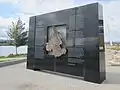 Described as a "Columbia River interactive art installation", the $3.5 million project was designed by artist Larry Kirkland. It features a 12-foot (3.7 m) stone and bronze structure called Headwaters (or sometimes the Headwaters Wall)[3] which has a cast bronze bas relief map of the Columbia Basin on the east side. The opposite side has an "engraved stone with a topographical map of the Columbia's origins", down which water falls into a shallow wading pool. According to KOIN, "one-inch-deep 'river' flows 150 feet along a molded riverbed dotted with stacks of granite representing each of the Columbia's tributaries".[4] In September, The Columbian reported on the "unsightly" white deposits left by water.[5] The water feature is maintained by the Vancouver Parks and Recreation Department.[6]
