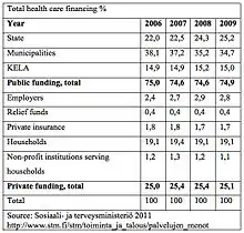 - "Health Expenditure and Financing in 2009". National Institute for Health and Welfare. Archived from the original on 2012-04-23. Retrieved 2011-12-13.