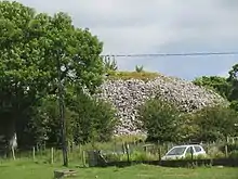 The cairn is 57 m (187 ft) in diameter and about 6 m high. There is a kerb of limestone blocks around the edge and probably a passage grave underneath.[4][5][6][7]