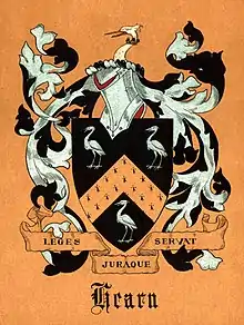 The coat of arms granted to Daniel James Hearn, of Correa, co. Westmeath, the use of which being restricted to his descendants,[12] are canting arms, bearing three heron, which have been closely associated with the name.[13]