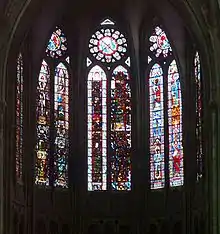 There were many reconstruction projects in Picardy in the aftermath of World War II. From 1951 de Pétigny began to accept commissions from the Monuments Historiques.[2] He was asked to create replacement stained glass windows for the Basilica of Saint-Quentin, which had been badly damaged during World War I (1914–18).[3] From 1954 Hector de Pétigny created 16 stained glass windows for the choir of the basilica in the upper levels of nine bays, each almost 14 metres (46 ft) high. He also created the stained glass of seven medallions of almost 2 metres (6 ft 7 in) in diameter, mounted above the windows.[4] He made stations of the cross in churches in Vorges, Coucy-le-Château and Marle, and made wooden decorations for the departmental archives in Laon.[2]