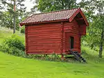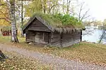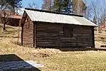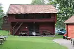 Körlogen (köra=drive;loge=a type of barn) is a former barn with doors large enough to let a horse cart in and out. The building was erect at Hedemora gammelgård in 1992-1994 and comes, like the härbre, from Skommargården in Ivarshyttan. | 60°17′4.8″N 15°58′39.5″E | Körlogen, Hedemora gammelgård |