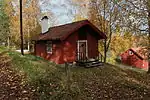 Dalska stugan (Da[h]l's cottage) was also a flax store from the 1800s. The cottage was Elin Dahl's summer home in Svensbo nearby Backa, and was donated to the Association Hedemora Gammelgård (Föreningen Hedemora Gammelgård) in connection with the celebration of the would-be 100th birthday of founding father Karl Trotzig. | 60°17′2.7″N 15°58′39.6″E | Dalska stugan, Hedemora gammelgård |