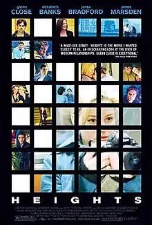 Heights is a 2005 Merchant Ivory Productions film that follows a pivotal twenty-four hours in the interconnected lives of five New Yorkers.[2] It stars Elizabeth Banks as Isabel, a photographer, James Marsden as Jonathan, a Jewish lawyer and Isabel's fiancé, Glenn Close as Diana, Isabel's mother, Jesse Bradford as Alec, an actor, and John Light as Peter, a journalist. Numerous prominent actors such as Eric Bogosian, George Segal, and Isabella Rossellini appear in supporting roles.