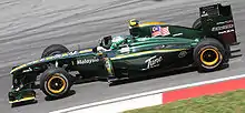 It was announced on 14 December 2009, that Kovalainen would drive for Lotus Racing in 2010 along with Jarno Trulli.[42] The team made their debut at the Bahrain Grand Prix on 14 March 2010. The car was off the pace in pre-season testing, due to a lack of downforce caused by the need for a conservative initial design.[43] Kovalainen finished in fifteenth position in the race, two laps down on winner Fernando Alonso.