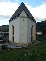 The chapel was built in the 15th century, replacing a chapel from 1422 that belonged to a Pestspital, a hospital for patients suffering from the plague. That building was badly damaged during the invasion by Turks in 1480. Four wealthy citizens including the Kornmesser, Pögl and Holzapfel families financed a new building.[1][2] It was erected from 1495 to 1497 as a monument of thanks for the survival of plague, hunger and war.[1] The donors were merchants who contributed to the flourishing of Bruck, located where important roads of the day met. Further donors whose names are mentioned in wall decoration belong to a younger generation. One inscription, dated 1504, mentions figura aura, the golden ratio which governs the proportions of the building.[1]: 14 Protocols dated from the 1540s confirm that the building was used for church services as a filial church of Bruck. In a protocol of 1617, Bishop Jakob Eberlein noted the triangular floor as unusual and demanded that the altars be returned to the apses, to concur with the intentions of the first builders, and to ease listening to masses from outside.[1]: 14