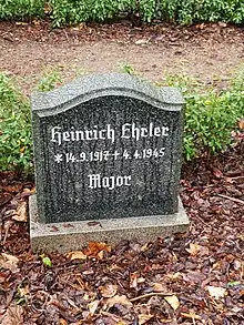 Scapegoated for the loss of the German battleship Tirpitz, Ehrler was court-martialled, stripped of his command and sentenced to three years and two months Festungshaft (honorable imprisonment).[1] Ehrler's sentence was later commuted and his loss of rank rescinded, and in February 1945 he was transferred to Jagdgeschwader 7 (JG 7–7th Fighter Wing). According to his fellow pilots, Ehrler thereafter flew in the increasingly desperate air battles without the purpose and dedication that had made him one of the Luftwaffe's most successful aces.[2] On 4 April 1945, he claimed his last three victories by shooting down two Allied bombers and destroying a third by ramming with his damaged aircraft after having run out of ammunition.[2]