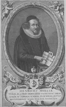 Heinrich Müller (18 October 1631 – 13/23 September 1675) was a German devotional author, Protestant writer of hymns, a Lutheran minister and theologian and a professor at the University of Rostock from 1647 to 1650. He famously denounced the font, the pulpit, the confessional, and the altar as "the four dumb idols of the Lutheran Church". He died in Rostock, aged 43.
