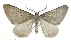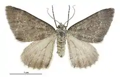 ♂︎. 35 mm. Head and palpi grey-whitish. Eyes olive-brown. Antennae dark grey, pectinations 5 but appearing shorter owing to being basally appressed to the shaft. Thorax grey. Abdomen whitish-grey. Fore-wings elongate-triangular, costa sinuate, apex bluntly pointed, termen straight, oblique ; bluish-grey ; lines faintly indicated in darker ; an irregular basal line at 1⁄6 ; first line at 1⁄3, double, slightly waved ; discal spot rather elongate, transverse, dark ; a fairly straight, slightly waved, median line ; second line from 2⁄3 costa to 3⁄4 dorsum, excurved on upper half, faintly margined with white on veins : cilia white, basally mixed with grey. Hindwings grey, slightly darker round termen : cilia white.[3]