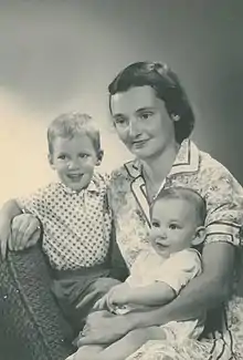 Helen and Alfred had been married six years when their son David was born, and their second son Daniel came along two and a half years later. The latter was named in part in honor of Helen's father, to carry on the family name, since there were no male heirs.[16] While taking on the responsibilities of caring for her young boys, Helen nevertheless continued her work at Aldrich on a part-time basis.[17] Beyond that, she had the full responsibility for the running of their household, including making houseguests feel welcome. Alfred frequently invited fellow chemists visiting from Europe, as well as art dealers and art historians, to stay in their home.[18] In addition, Alfred would often travel to Europe in support of the chemical business, as well as visiting art galleries in search of fine paintings. Helen frequently accompanied him on such European trips.[19]