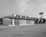 The mid 1950s saw Fong working on two of her firm's most well-known designs, Norms Restaurant and the Holiday Bowl.[6] The Norms designed by Armet and Davis in 1955 was not their first location, but the building's iconic pennant-based sign and semi-open kitchen design became hallmarks of the company's image.[6] Fong's interior design aimed to make the restaurant more efficient for guests and employees, as well as creating spectacle that would lure in new customers.[6]