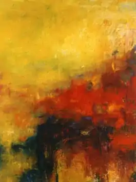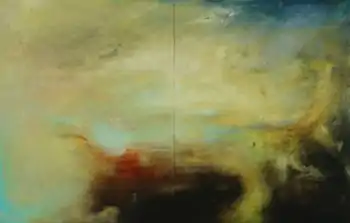 Critics note, however, that O'Toole realizes those qualities less by an engagement with observed reality or specific narrative than through the potentialities of paint, worked in a manner that Chicago Tribune reviewer Alan Artner identified as a "kind of spiritual quest" similar to that of early abstract modernists.[8][5] Others have described her process as a never-resolved battle[4] or, in Arts Magazine critic Kathryn Hixson's words, an attempt at "approaching the sublime—another world—through personal struggle with materials capable of, but resisting, being controlled."[5] In early works, such as Pungence (1991)[31] and Pagan Pilgrimage (1992), O'Toole created atmospheric expanses and pictorial incident through washes, drips, spills, gesture and texture.[5][12] Some early reviewers suggested the level of painterly incident could have been pared down;[32][33] others, such as James Yood, affirmed what he termed the "seething ebb and flow of the forces of color" and precarious, "nervous balance of pictorial forces."[4] In the late 1990s, O'Toole turned to a more deliberative process of working wet-on-wet layers of paint that she scraped and scumbled (e.g., Mustard Field, 2000)—often over several years—in a manner sometimes compared to the measured work of farming.[28][10][1] O'Toole herself has said, "The paintings are built slowly, made in layers, with a similar measure to working the soil, revealing the strata of the bog, negotiating clumsy, crusty limestone fields at a deliberate pace."[34][2]