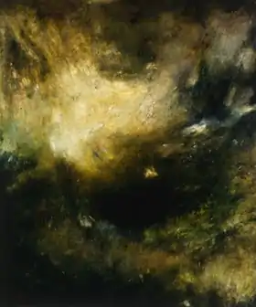 Critical considerations of O'Toole's work have often focused on her longstanding engagement with place and landscape through abstraction.[7][16] Early reviews describe her "nature-derived abstraction"[22][23] as displaying an Abstract-Expressionist "sense of natural flux";[24][25] writers two and three decades later discuss her work as existing on the cusp between abstract and figurative and being rooted in observable facts that are "summoned only to dissolve."[26][10][7] Critics compare her painting to art spanning almost two centuries, suggesting qualities of both historical consciousness and contemporaneity; representative works such as Mary Larkin's Bottom (2013), for example, are often compared to those of early 19th-century painter J. M. W. Turner[8][27][13]—known for his luminous, atmospheric and turbulent landscapes that border on abstraction—and those of 20th-century abstract artist Mark Rothko, known for monumental, contemplative color field paintings.[13][28] Writers also liken her work to the subjective, late landscapes of Caspar David Friedrich, the "dim complexity" of Albert Pinkham Ryder's seascapes,[26] and the "pensive and brooding" landscapes of fellow West-Irish artist Jack Butler Yeats.[4][12][5][28]