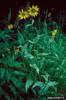 Helianthella quinquenervis is a herbaceous plant up to 150 cm (4.9 ft) tall. Leaves are larger than those of most related species, up to 50 cm (20 in) long, each with 3 or 5 prominent veins running the length of the leaf. The plant usually produces only one yellow flower head per stem, nodding (hanging). Each head contains 8-21 bright yellow ray flowers surrounding numerous yellow disc flowers.[6]