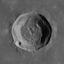 Helicon is a small lunar impact crater that is located on the north part of the Mare Imbrium. The crater was named after 4th century BC Greek astronomer Helicon of Cyzicus,[1] a friend and disciple of Plato.[2] To the northwest is the prominent Sinus Iridum, a mountain-ringed bay on the mare. Just to the east is the slightly smaller crater Le Verrier.